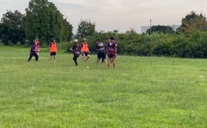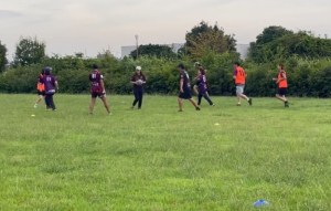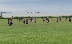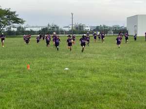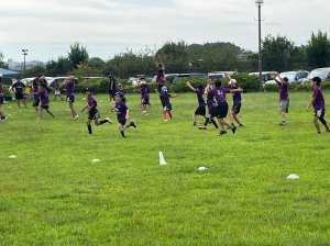 6年生が声をかけて、まるでタッチラグビーのディフェンスラインのようなオニラインを敷いていました。
