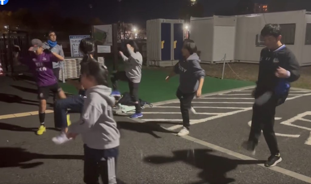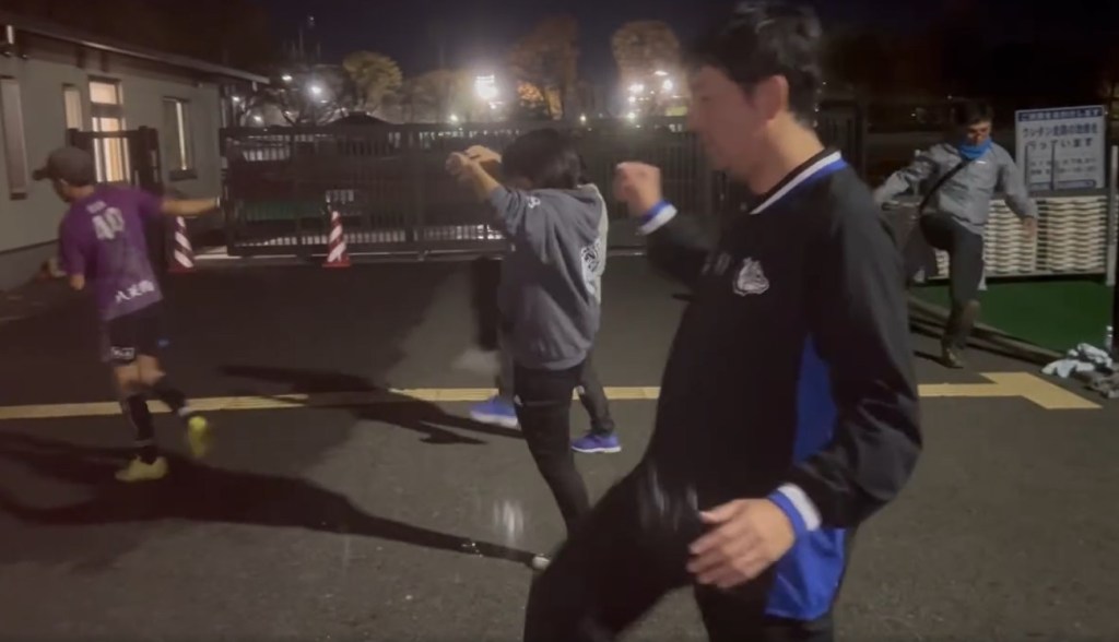 たまたま人工芝を発見。少しでも負担が無いように実施。