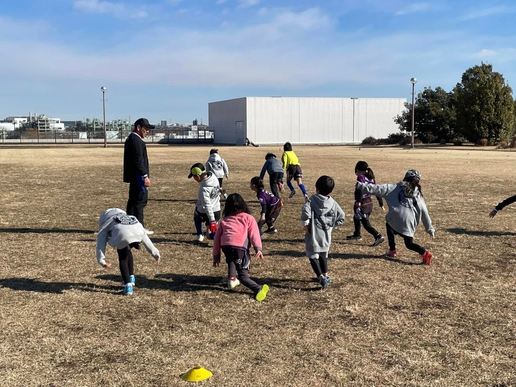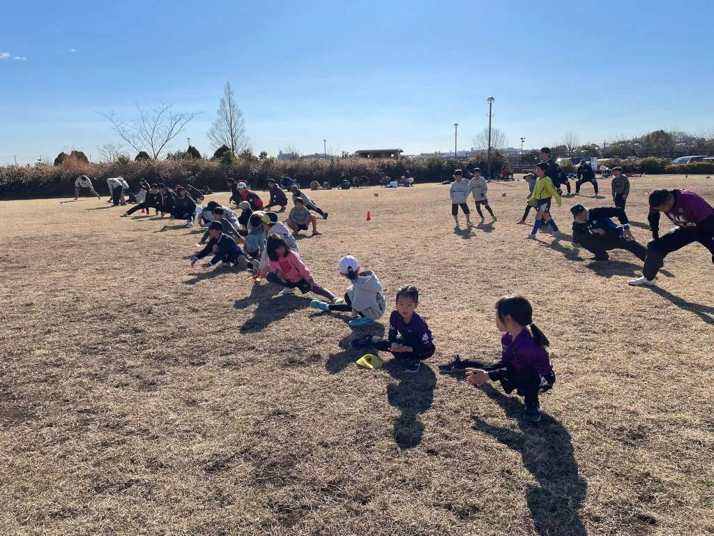 ウォーミングアップ。カニ歩き!?大人は苦手なメニューです😢